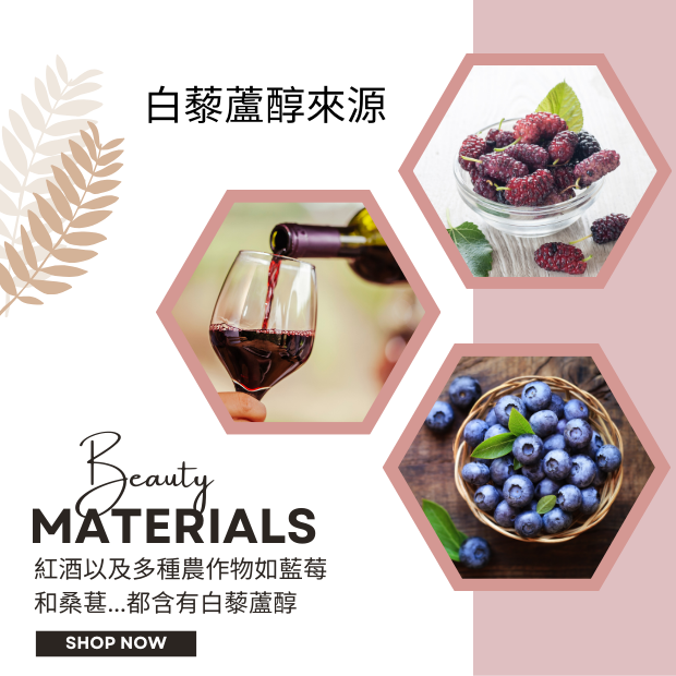 是一種非黃酮的酚類化合物,為植物為抵抗細菌或病毒入侵所分泌的毒素存在於紅酒、葡萄、桑葚、藍莓等食物中,擁有良好的抗氧化、美白、抗發炎能力對於各位想水水欸島ㄟ帥哥美女,是一定要認識的辣~